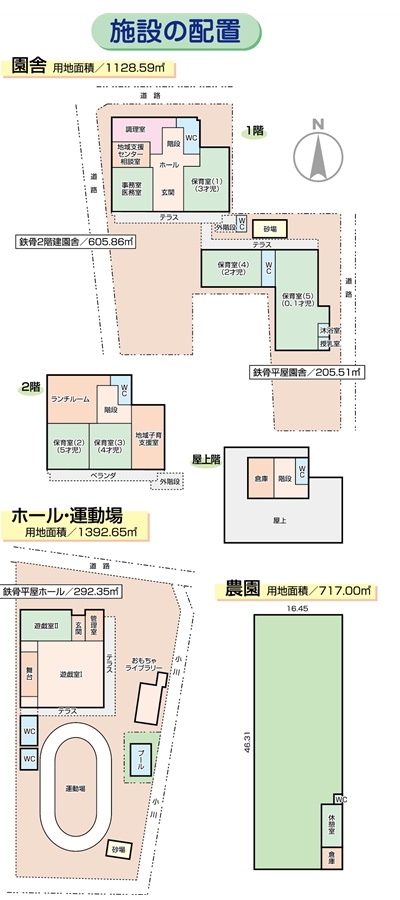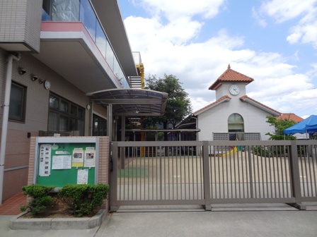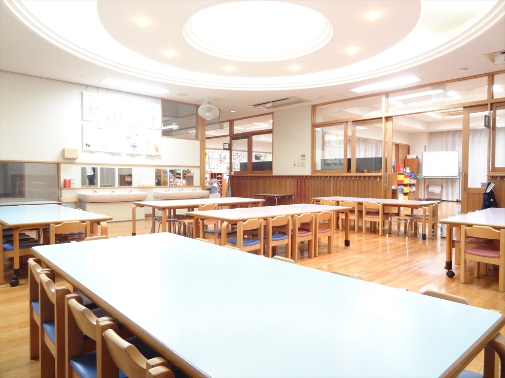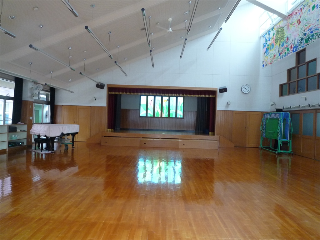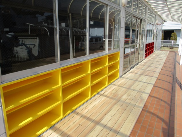 園舎とホールの入り口に、樹齢八十年以上の大阪府産ひのき材で作られたウッドデッキを取り付けました。このウッドデッキは、大阪府子育て施設木のぬくもり推進事業の助成で設置しました。