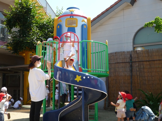 共同募金会のご協力により園庭に遊具「スターロケット」を新設させていただきました。当園の目標である、「情操豊かな子ども」の育成のために現在、多くの園児たちが活用しています。空に届きそうな高いロケットに登り、宇宙への関心、想像力を膨らませております。